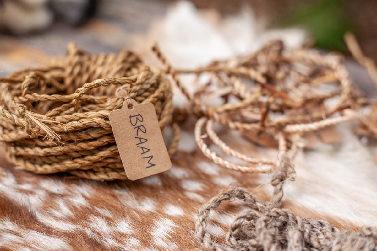De materialen die we gebruiken kunnen o.a. zijn van sparrenwortel, braam, hennep, pitrus en/of brandnetel. Als voorbeeld hebben een grote scala aan materialen waar ook touw van gemaakt wordt.